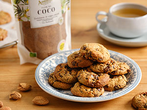 Una merienda o desayuno fácil y resultón: galletas de almendra con pepitas de chocolate y Flor de coco Azucarera que les dará una nota acaramelada. ¡Irresistibles!