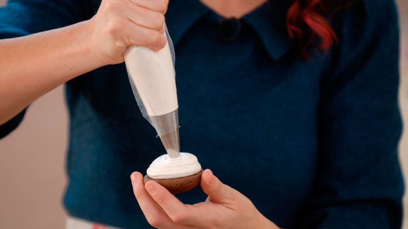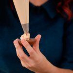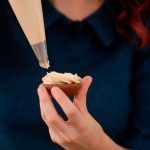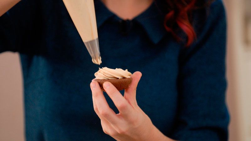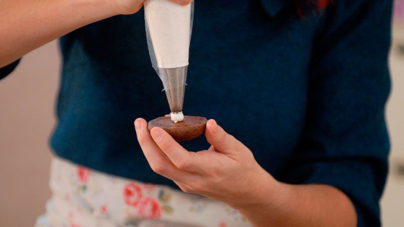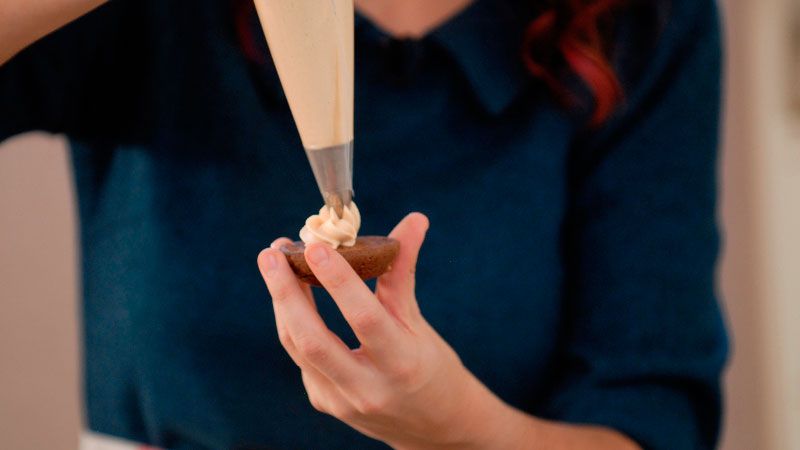 Usa la manga pastelera con la boquilla redonda para rellenar las mitades con la crema de nubes. Para la crema de mantequilla de cacahuete, utiliza la boquilla de estrella.
