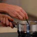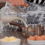 A continuación, vierte en un cazo la leche con el azúcar, la mantequilla y la sal, y calienta poco a poco, hasta que se derrita la mantequilla pero sin que llegue a hervir.