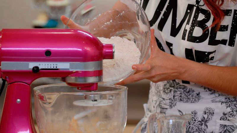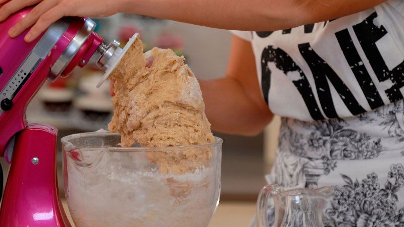 A continuación, incorpora poco a poco el resto de la harina, y bate a velocidad baja-media. Tras 3 ó 5 minutos, la masa estará elástica y no pegajosa.