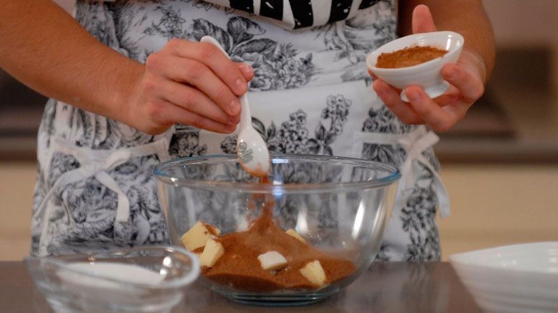 En un bol, mezcla todos los ingredientes con un par de cuchillos, hasta que la mezcla parezcan migas.