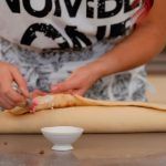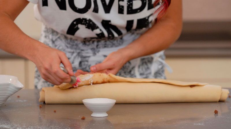 Echa el relleno por encima y enrolla formando un rollo de masa, pegando los extremos con un poquito de nata líquida o leche.