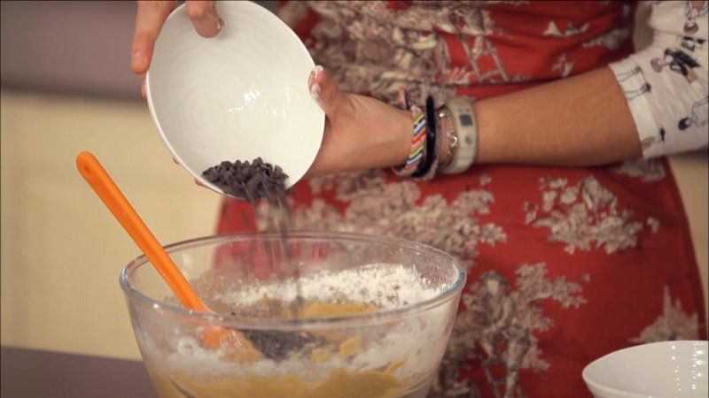 Añade la mantequilla, la vainilla en pasta y los chips de chocolate, bate de nuevo, hasta obtener una mezcla homogénea.