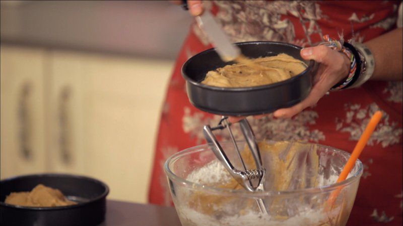 Hornea a 180 durante unos 25-30 minutos, o hasta que los bordes del bizcocho se separen ligeramente del molde y al introducir un palillo salga limpio.