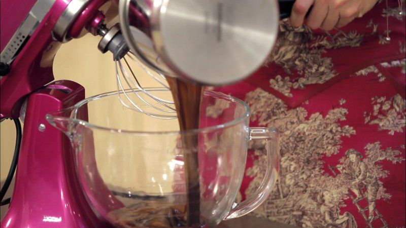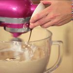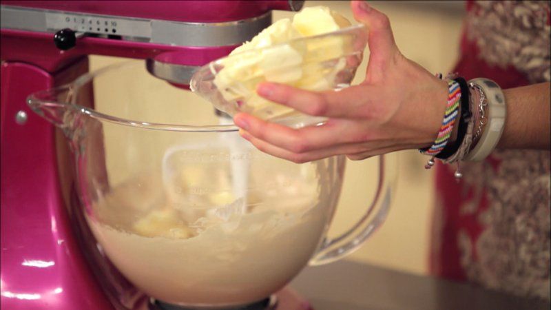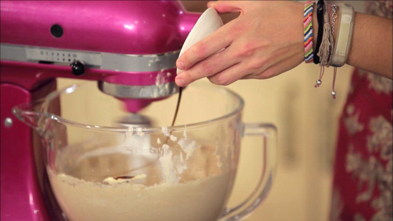 Cuando el merengue esté listo, añade la mantequilla, batiendo a velocidad media, e incorpora la vainilla en pasta y bate 5 minutos más..