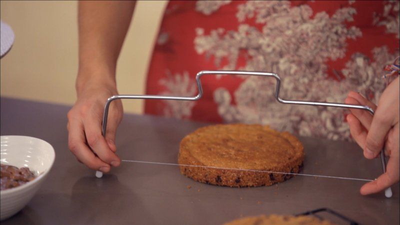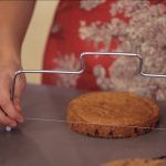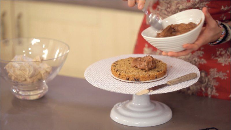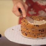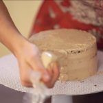 Para decorar la tarta comienza aplicando una primera base regular a toda la masa de bizcocho.