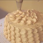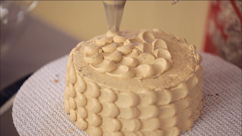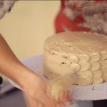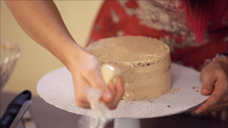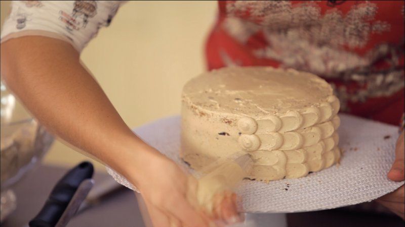 Aplica puntos de crema en fila, en el lateral de la tarta y, con ayuda de la espátula, reparte cada punto realizando un dibujo similar a las escamas.