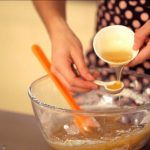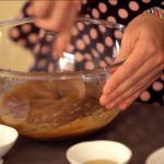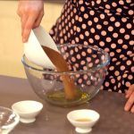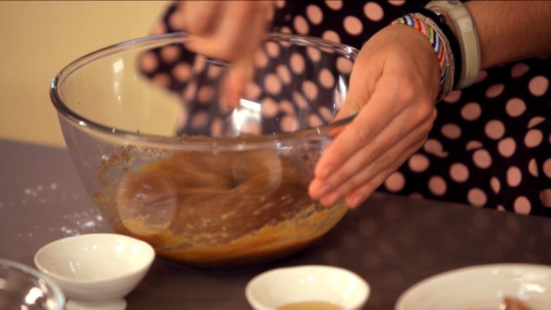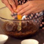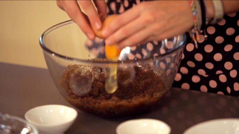 Bate el aceite de oliva suave y el azúcar moreno hasta que se integren e incorpora los huevos, uno a uno.