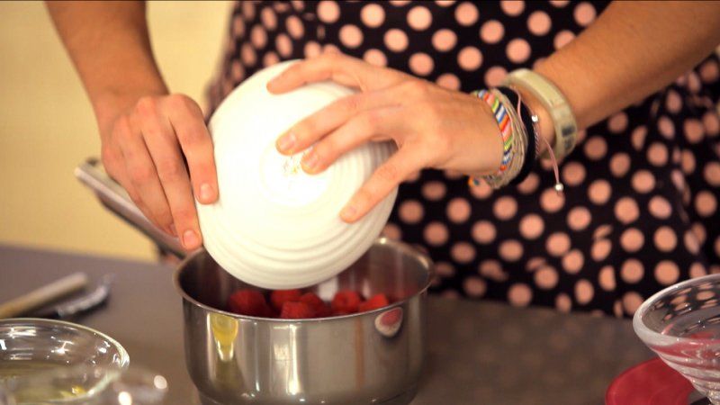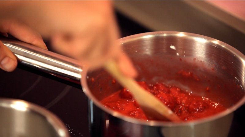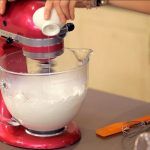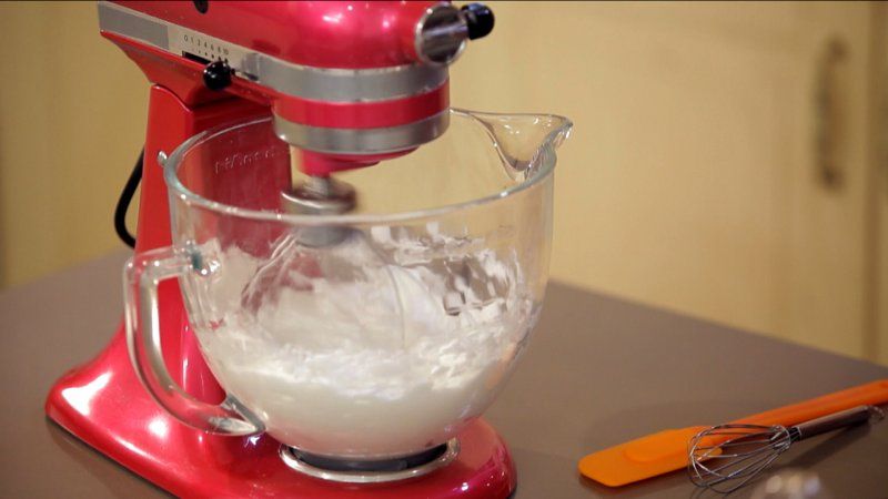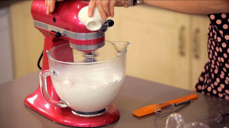 Añade el extracto de frambuesa y sigue batiendo hasta que el merengue esté brillante.