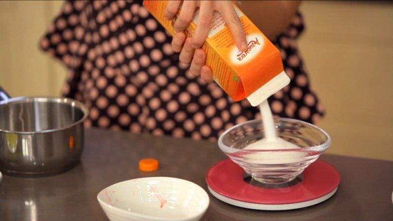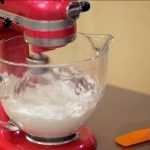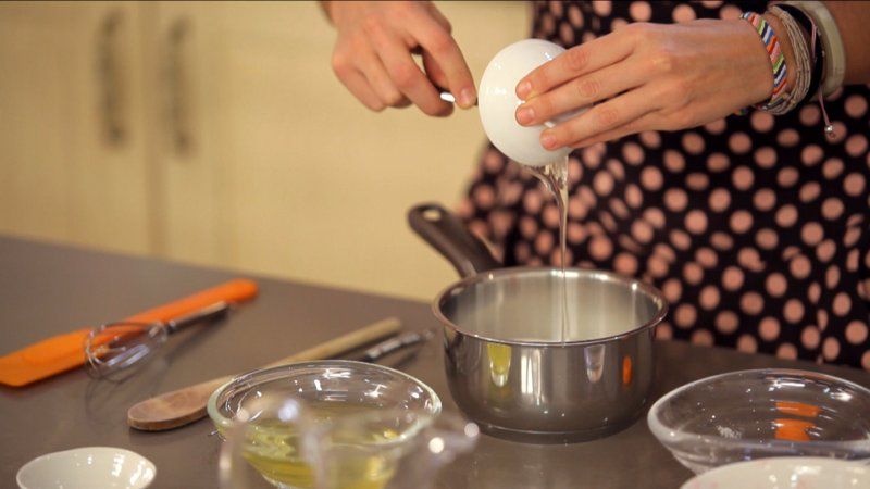 Cuando el almíbar haya alcanzado la temperatura indicada, échalo sobre las claras muy poco a poco, sin dejar de batir, como si fuera un hilillo, con cuidado de que el almíbar no caiga en las varillas de la batidora.