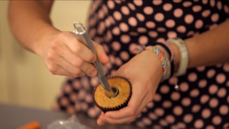 Realiza un agujero en el centro de cada cupcake con ayuda de un descorazonador de manzanas, vierte una cucharada de la salsa de frambuesa en el interior y vuelve a colocar el trocito de masa que has sacado.Por último decora la superficie del cupcake con el merengue, ayudándote de una manga pastelera con una boquilla de estrella abierta.