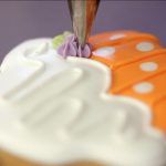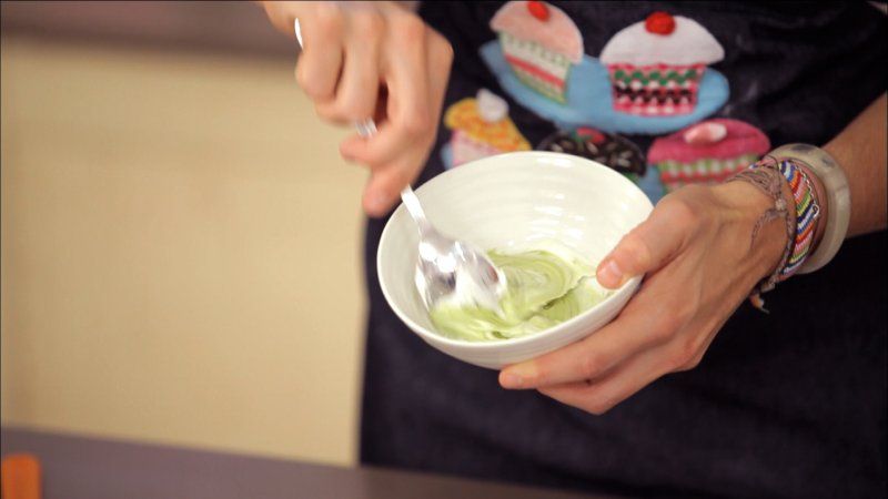 Primero coge dos buenas cucharadas de glasa, tiñe una cucharada de color verde y resérvala en una manga pastelera con boquilla de hoja; y tiñe la otra cucharada de glasa de color morado y resérvala en una manga pastelera con boquilla estrella pequeña.