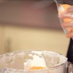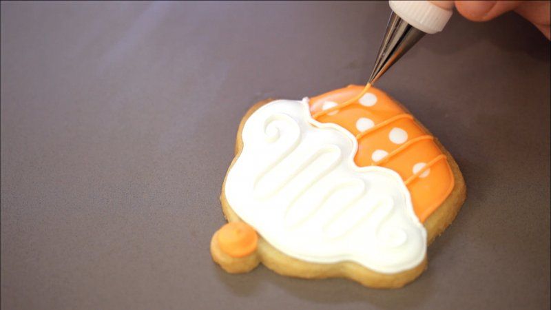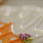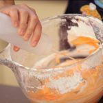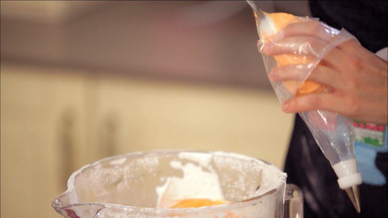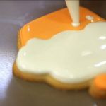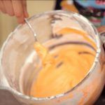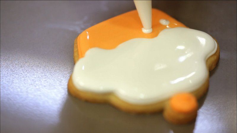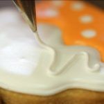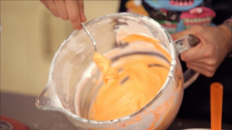 Divide el resto de la glasa en dos boles. Tiñe un bol de naranja pastel y otro de blanco.
