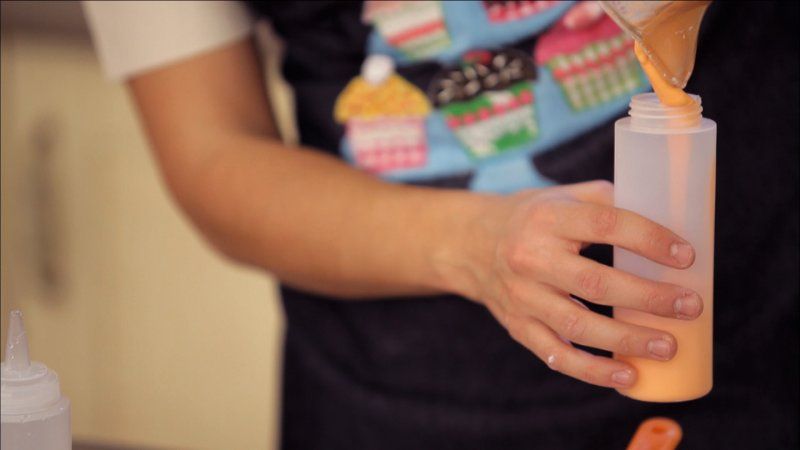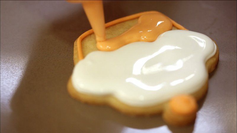 Para decorar el interior del dibujo, necesitamos glasa de relleno, más líquida, para ello  rebaja el bol de glasa naranja y el bol de glasa blanca con un poquito de agua y mete cada color en un biberón de salsa diferente.