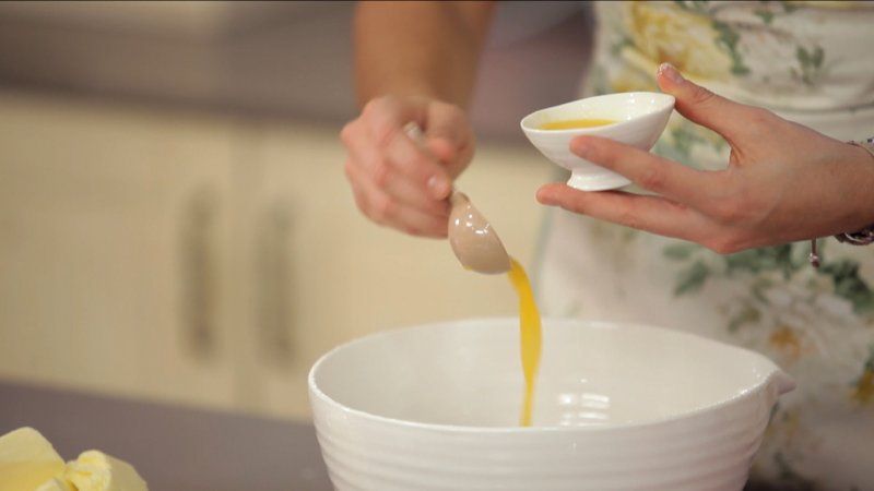 Cuando se haya disuelto el azúcar, monta las claras de huevo a punto de nieve. Una vez tengas el merengue listo, incorpora la mantequilla y el extracto de naranja.