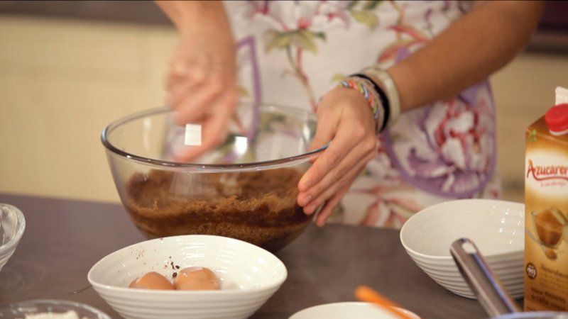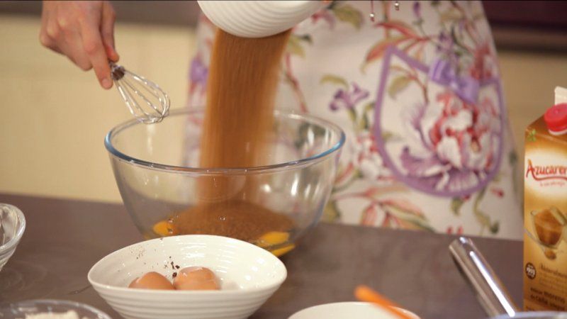 Mientras, en un bol, bate el azúcar moreno, los huevos y la vainilla en pasta hasta que la preparación esté bien integrada y esponjosa.