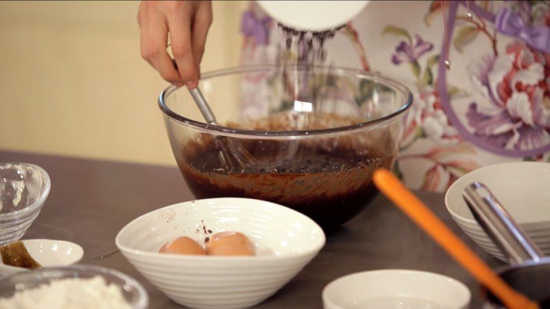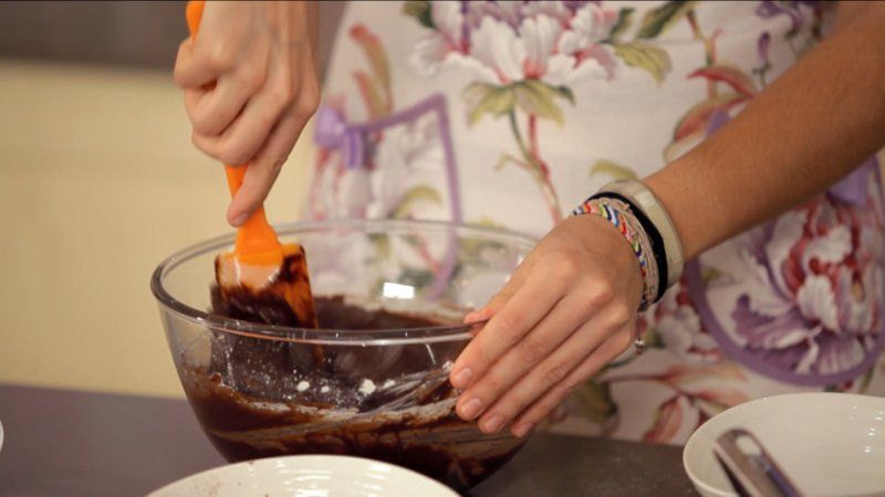 Vierte poco a poco el chocolate derretido, sin dejar de batir. A continuación, añade los chips de chocolate.