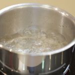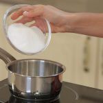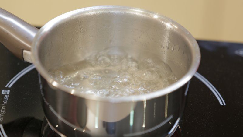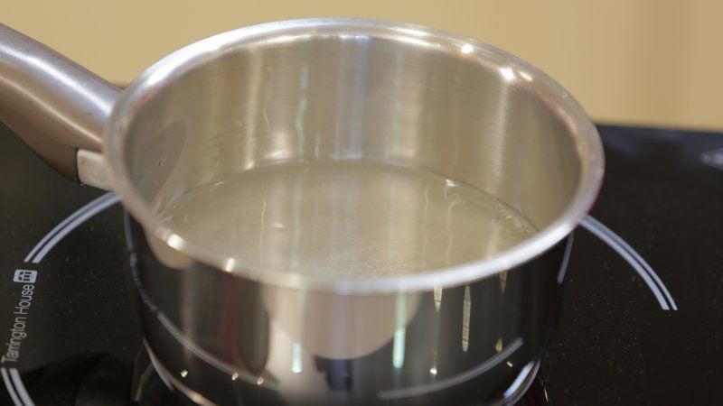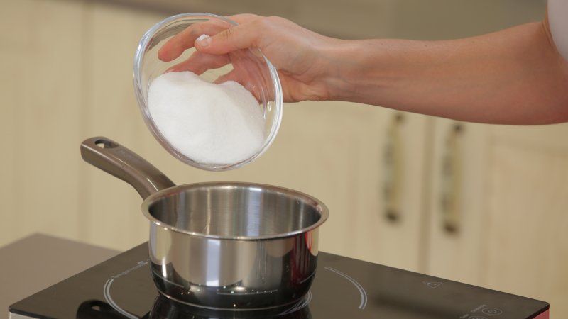 Pon a hervir el agua con el azúcar blanco en un cazo y deja que hierva, a fuego lento, hasta que se disuelva el azúcar.