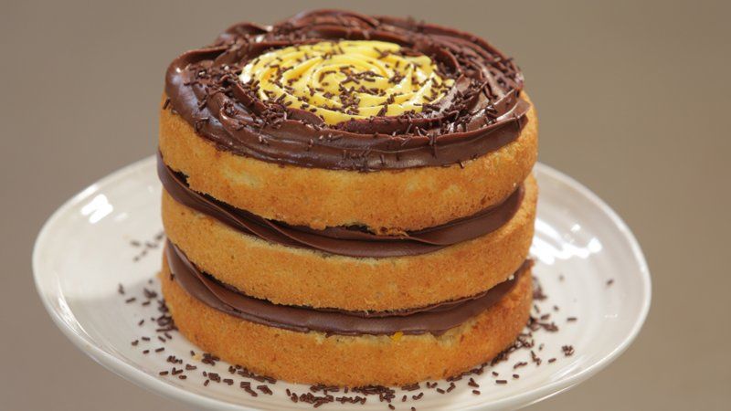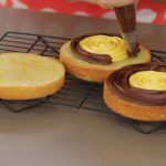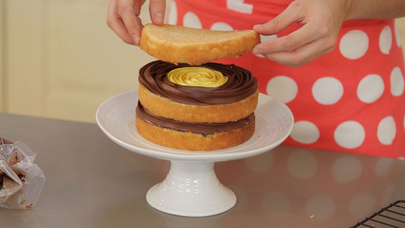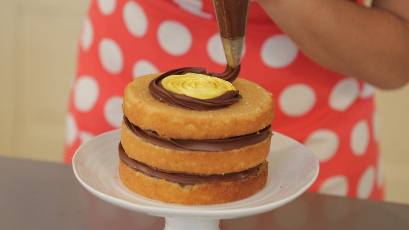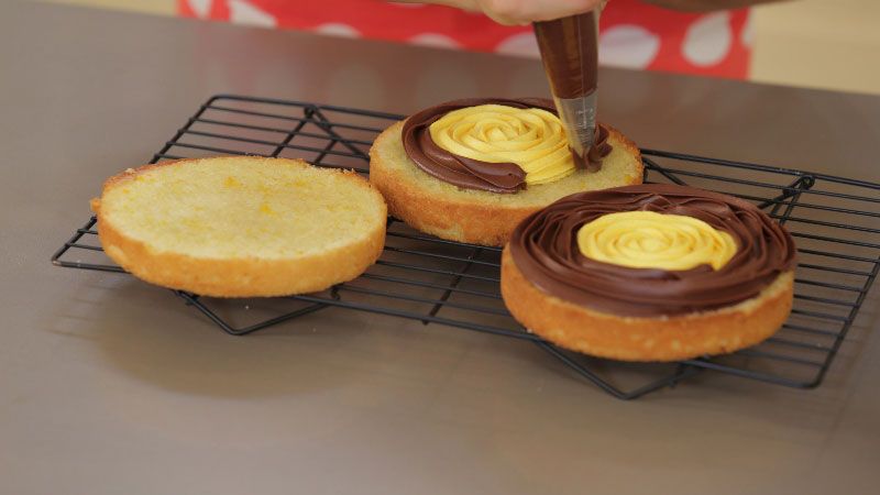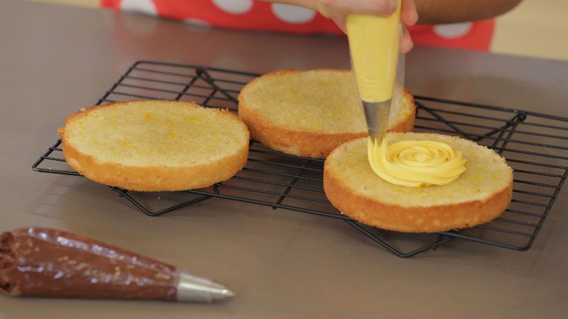 Decora 2 bizcochos con la crema de naranja en el centro y el ganache alrededor.