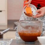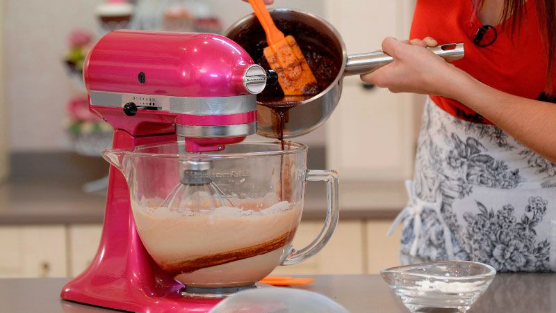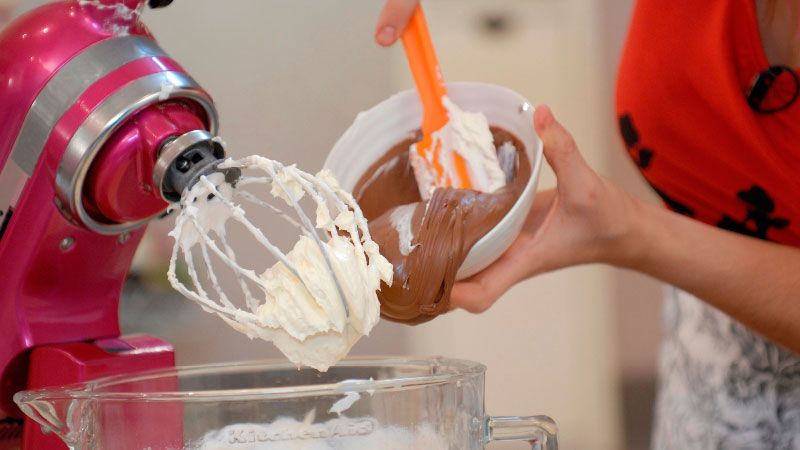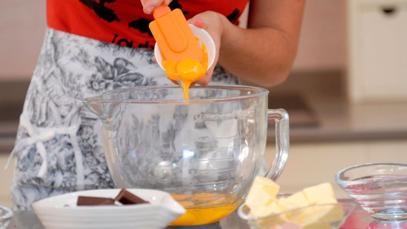 Incorpora el chocolate derretido poco a poco y mezcla con cuidado, intentando que no se bajen los huevos.