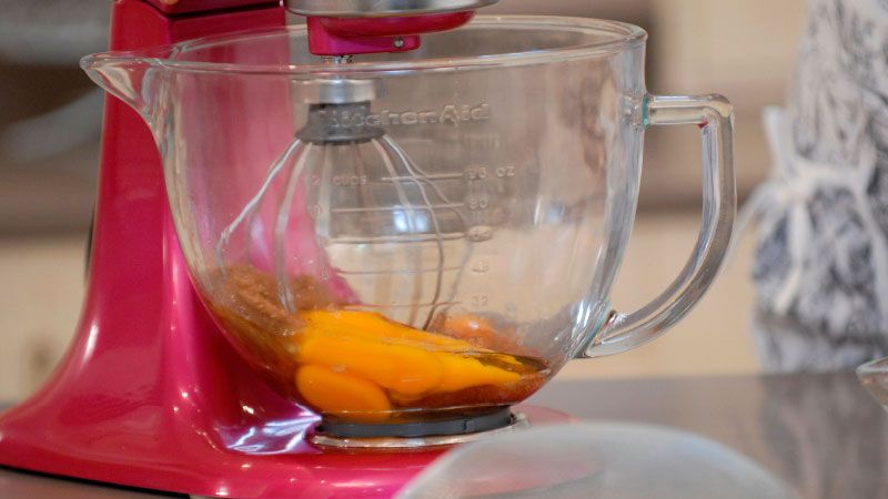 En un bol, vierte los 5 huevos, las yemas extra y el azúcar moreno y bate con las varillas hasta que doblen su volumen.