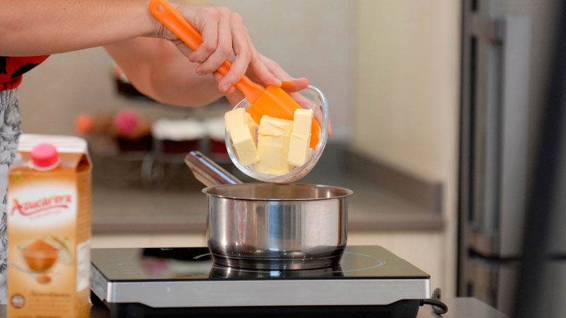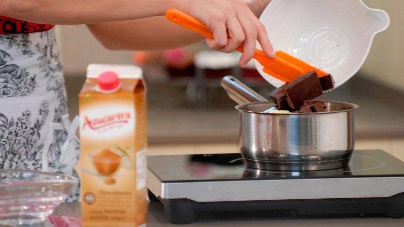 Mientras tanto, calienta a fuego lento en un cazo el chocolate troceado y la mantequilla hasta que se derritan por completo. Retira del fuego y déjalo templar.