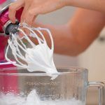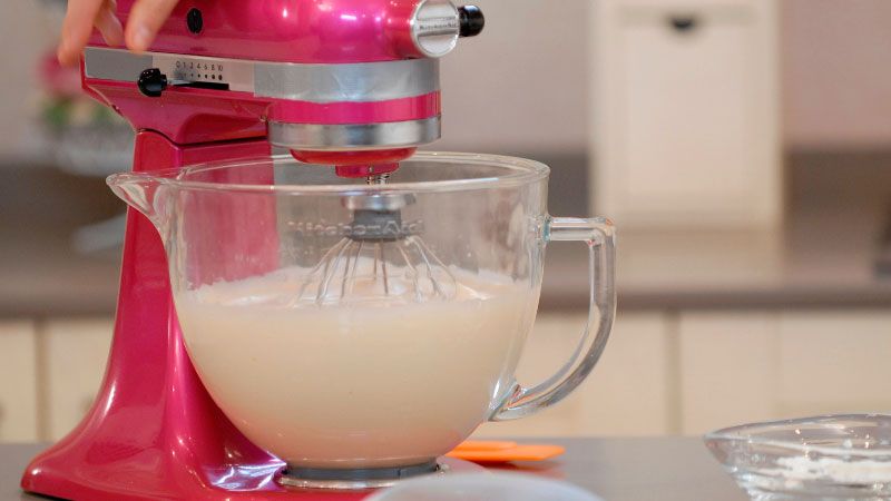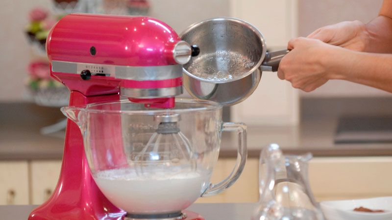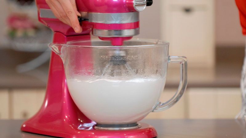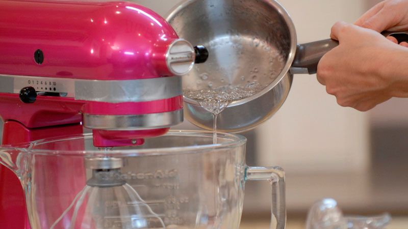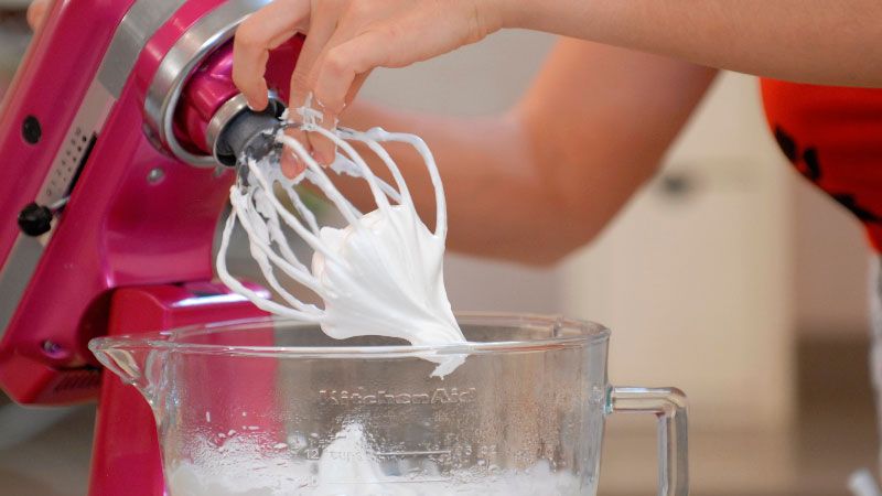 Cuando el almíbar haya alcanzado la temperatura indicada, viértelo sobre las claras muy poco a poco, sin dejar de batir, con cuidado de que no caiga el almíbar en las varillas de la batidora. Continúa batiendo hasta que el merengue esté brillante.