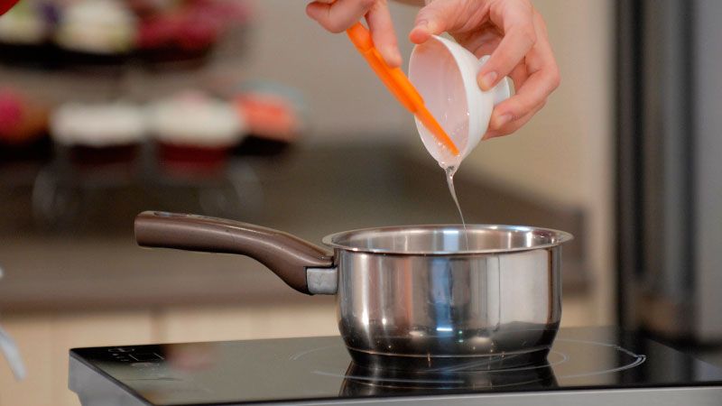 Mientras tanto, mezcla el agua con el azúcar y el sirope en un cazo y ponlo a calentar hasta que la temperatura del termómetro de azúcar alcance los 115°-120°.