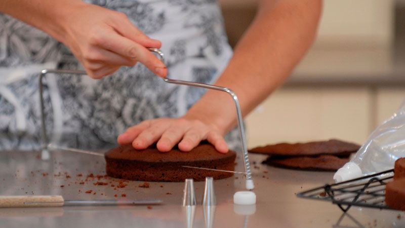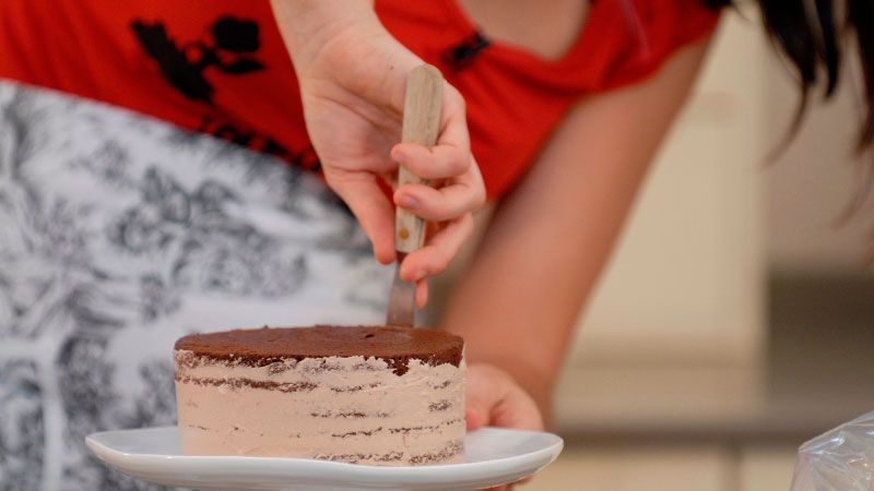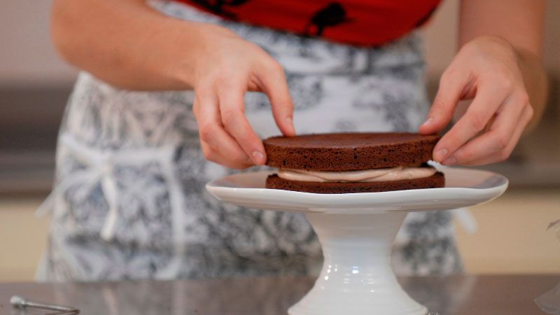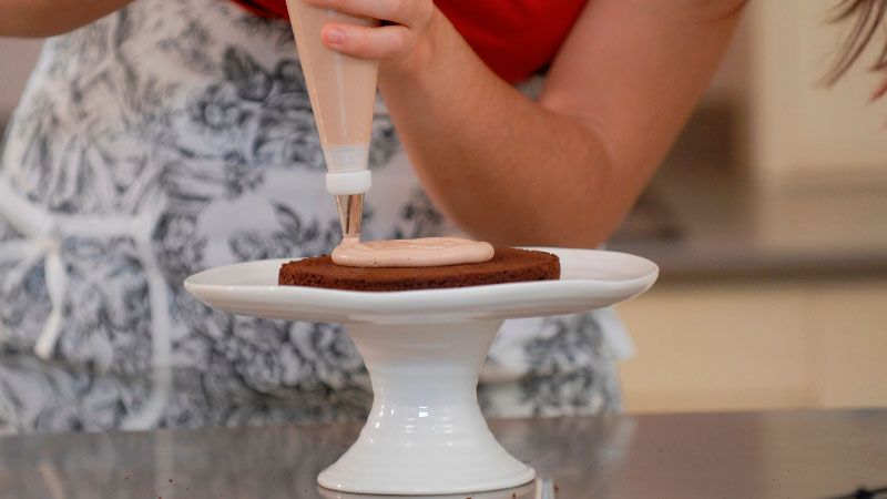 Rellena con una capa de crema en forma de espiral, entre cada piso de bizcocho con una manga pastelera con boquilla redonda. Monta cada bizcocho sobre el anterior y cuando tengas todos colocados, unta una capa fina de crema por toda la tarta.