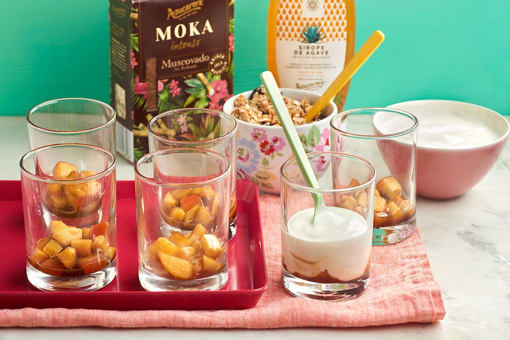 - Montamos los vasitos colocando una base de compota de manzana, el yogur, granola y terminamos con una rodaja de manzana desecada