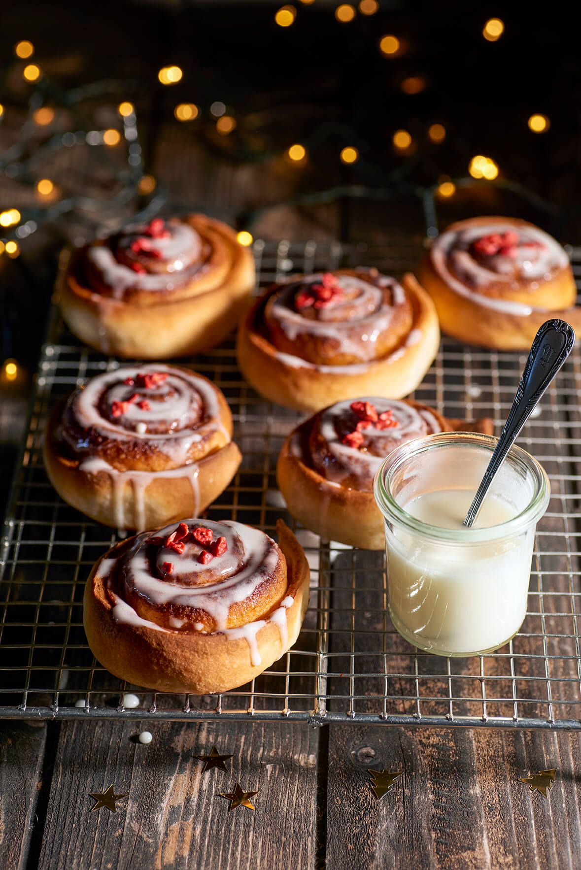 3. Para el glaseado: Batir el queso con el azúcar y la leche con ayuda de una batidora hasta que quede una mezcla homogénea. Repartir por encima de los rollos. Espolvorear con los frutos rojos.