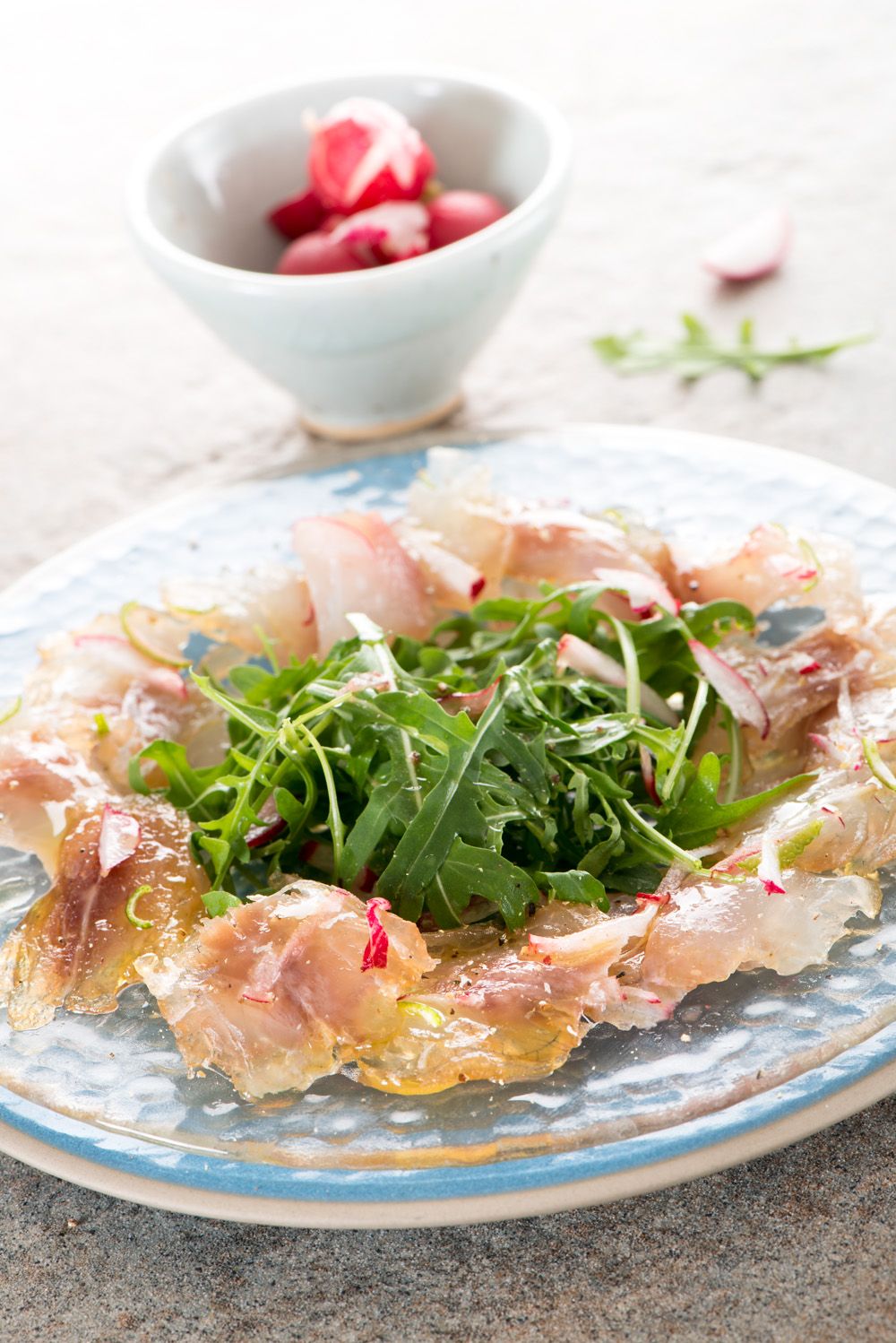 Nuestra propuesta es una dorada marinada con azúcar moreno acompañada de  una ensalada de rúcula.