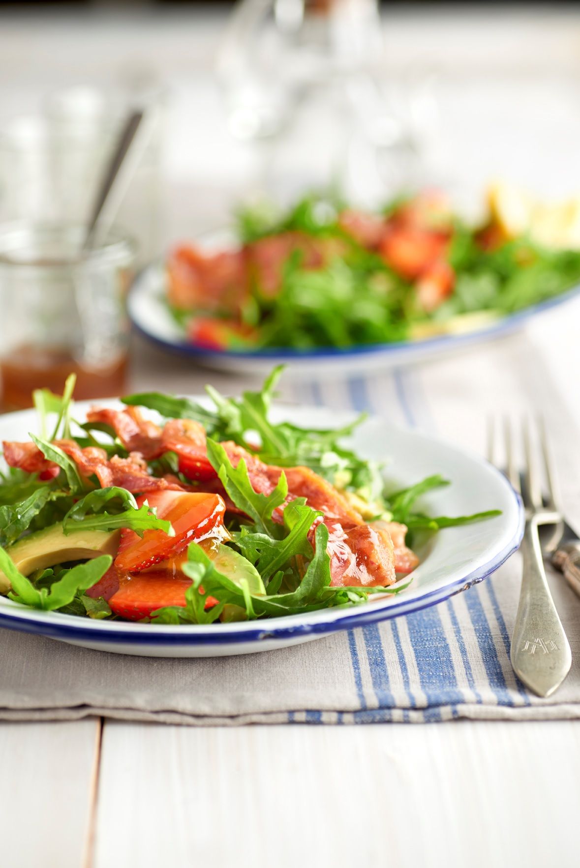 Por último, dispón las hojas de rúcula en un plato o fuente, junto con el beicon, los fresones y el aguacate y aliña con la vinagreta. Sírvela rápido y ¡a comer!