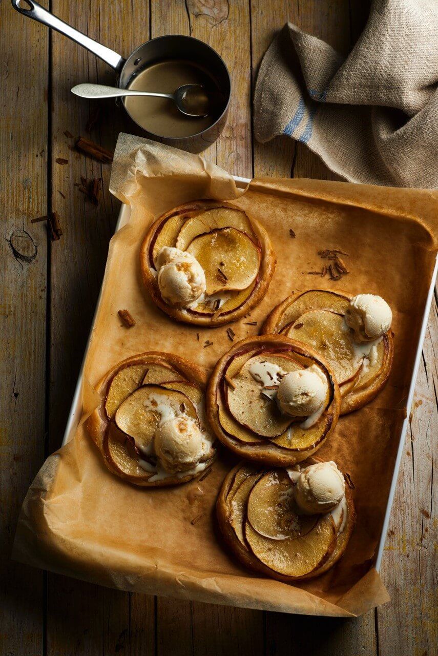 Pinta las tartaletas con un poco de almíbar y sirve con canela rota y con una bola de helado si se desea.