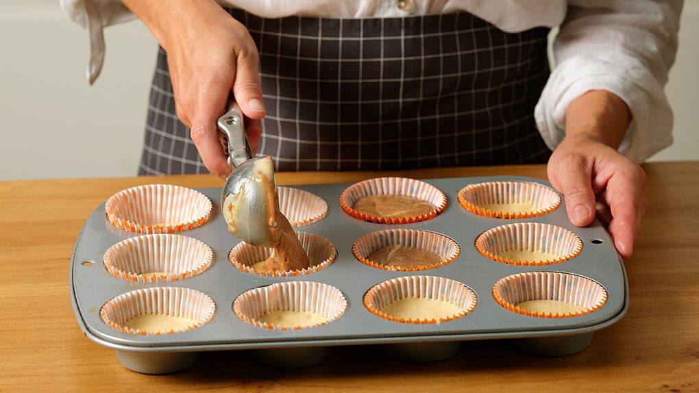 4. Distribuir las dos mezclas en un molde para magdalenas con papel rizado y cocerlas en el horno, precalentado a 200ºC, durante 15 minutos.