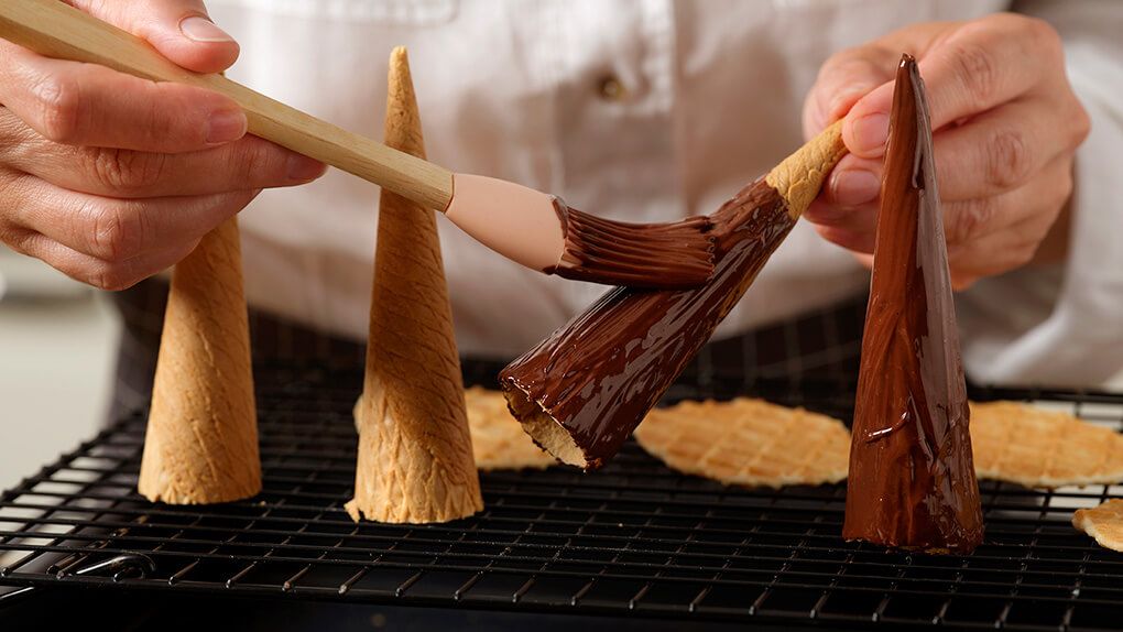 6. Pintar con el chocolate los conos y las obleas redondas en el chocolate, escurrir, juntar formando un sobrero (pegar con el chocolate) y refrigerar durante 5 minutos.