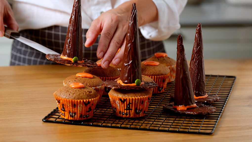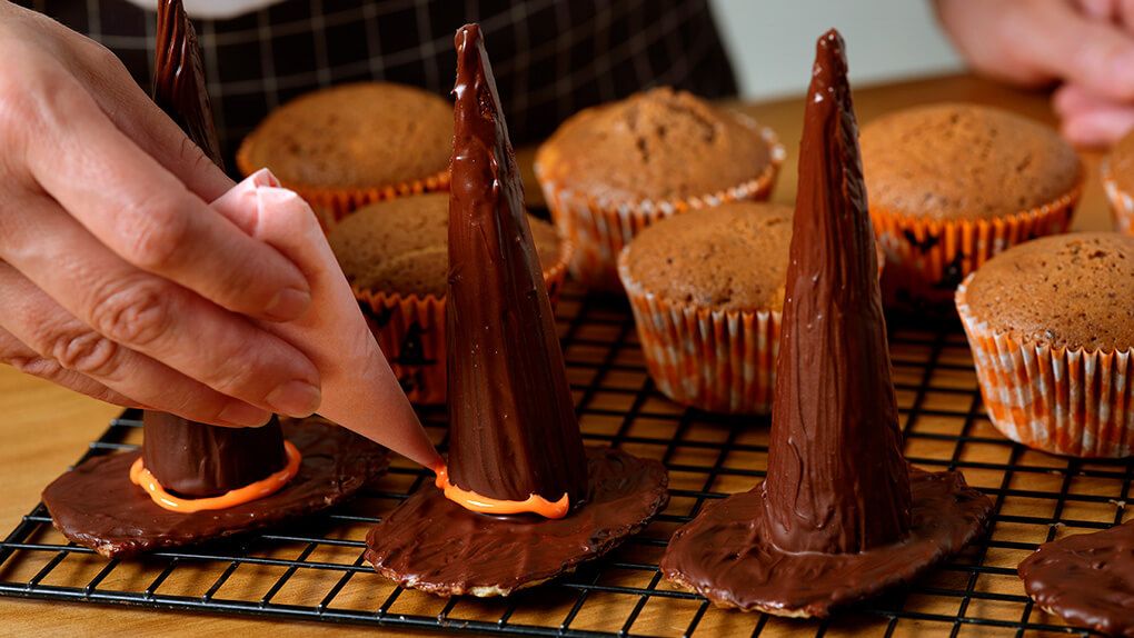 1. Batir la clara de huevo con el azúcar y el colorante. Añadir un poco de zumo de limón para que tenga una textura más untuosa, introducirla en un pequeño cono de papel de horno o en una manga pastelera de boquilla fina y decorar la circunferencia del gorro de bruja.