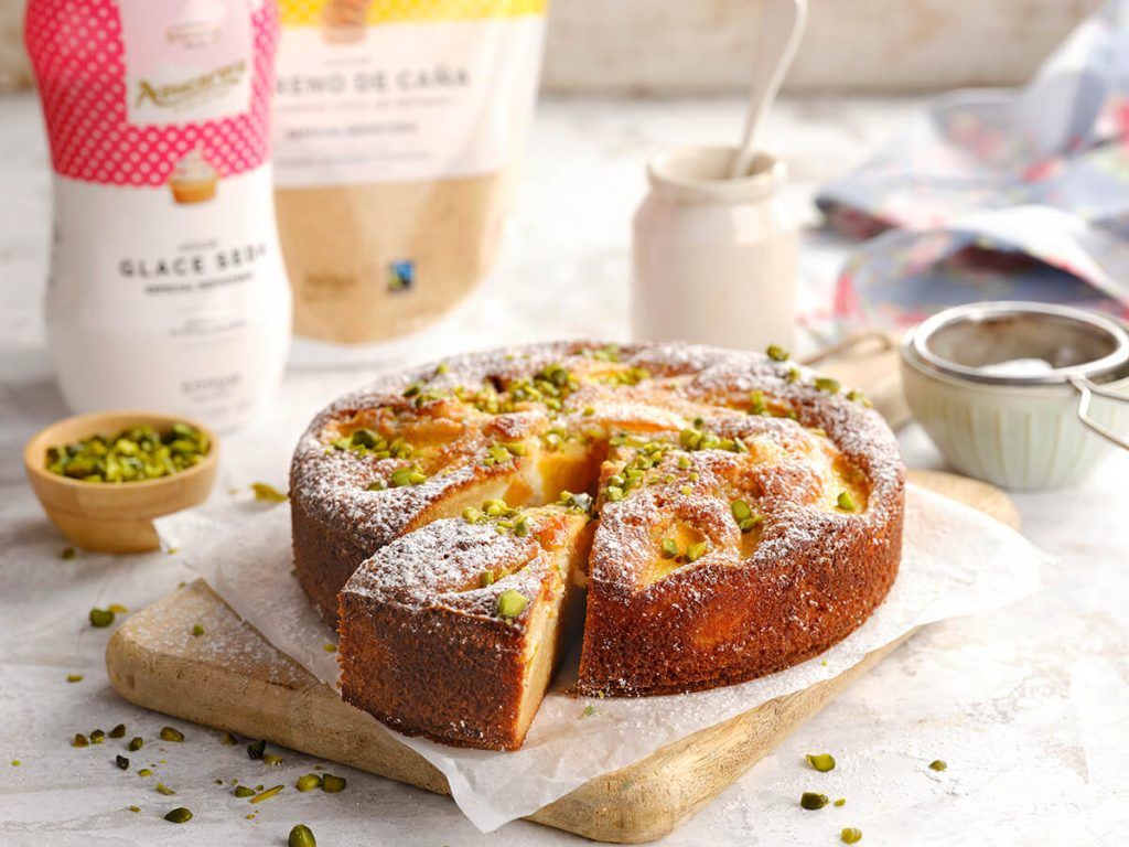 5.  Retirar del horno y dejar enfriar completamente antes de desmoldarlo. Una vez frío, desmoldar y servir con los pistachos picados y el azúcar espolvoreado.