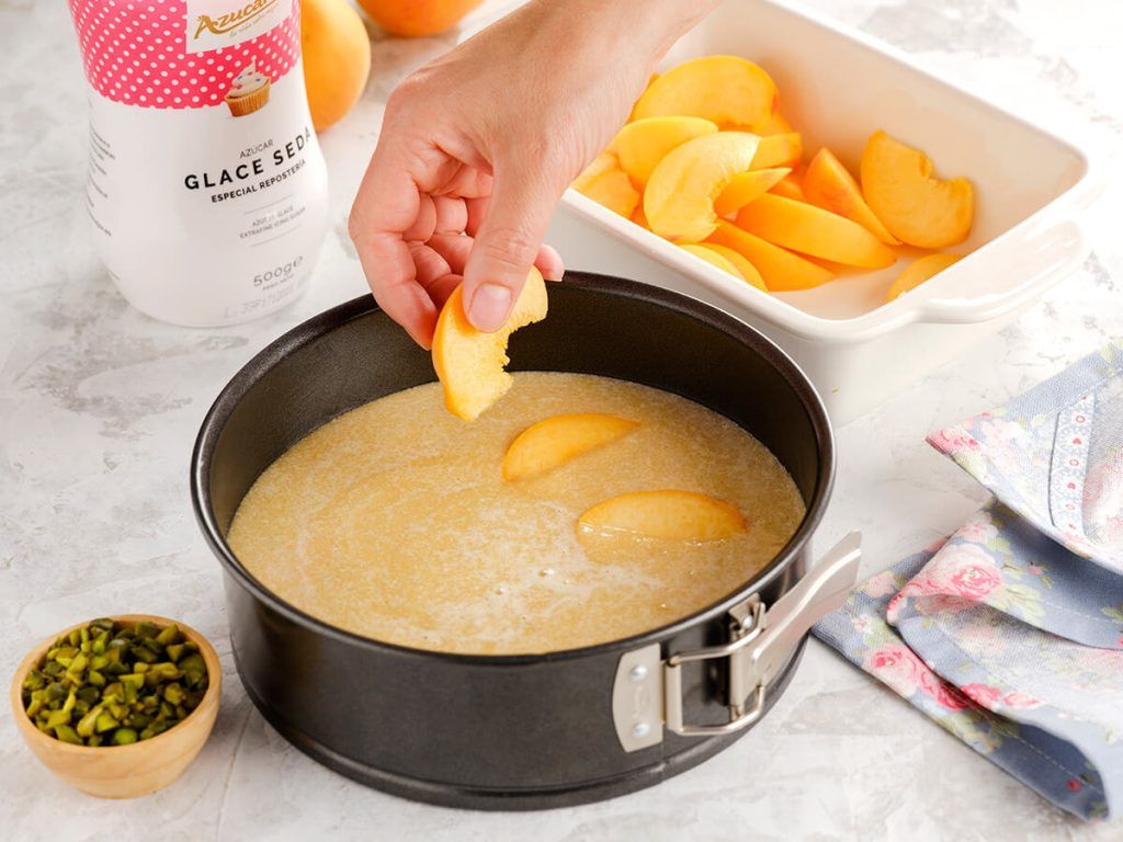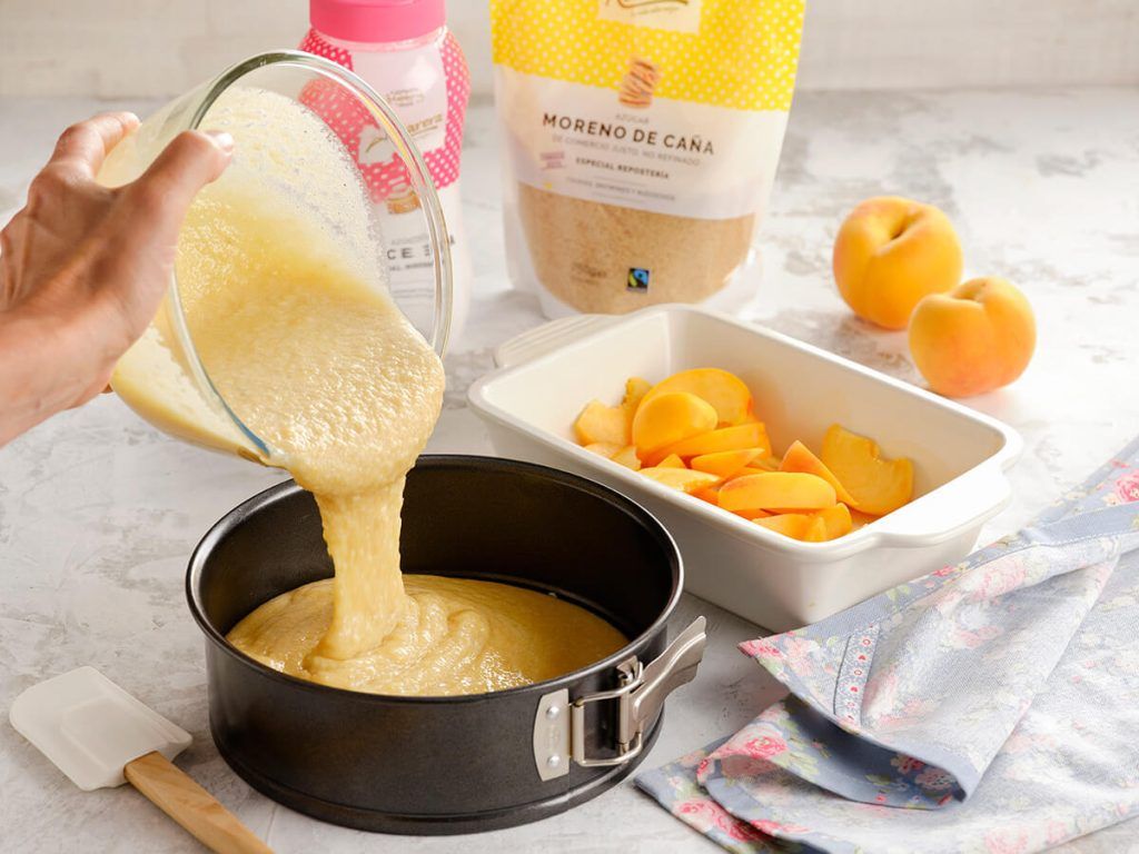 3. Verter la mezcla en un molde redondo, previamente engrasado. Lavar y cortar los melocotones en gajos no muy gruesos y distribuirlos sobre la masa.