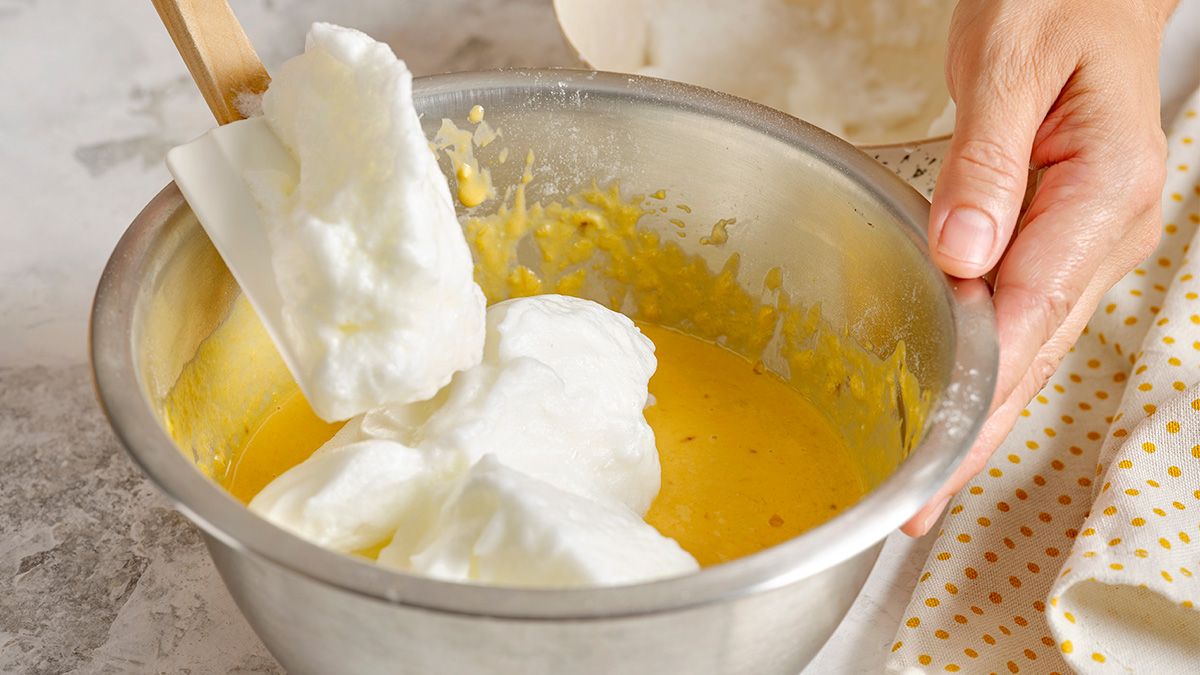 3. Añadir el puré de calabaza y mezclar. Incorporar unas 3-4 cucharadas del agua de la cocción reservada para aligerar un poco la masa. Por último, montar las claras a punto de nieve y agregarlas mezclando con movimientos envolventes.
