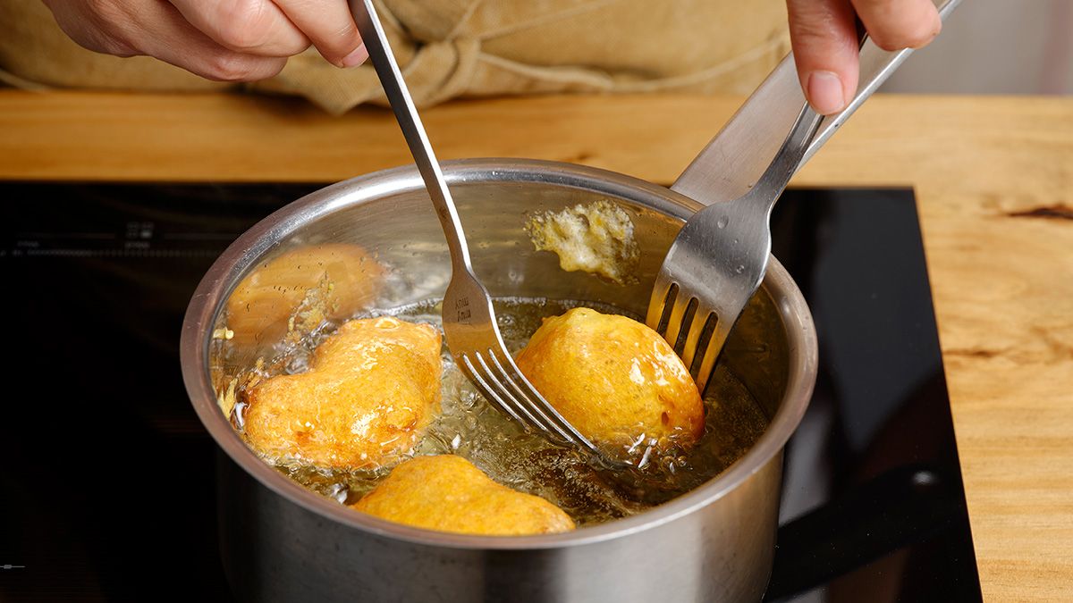 4. Rellenar una manga pastelera con una boquilla redonda con la masa resultante. Calentar el aceite en una sartén y, cuando esté caliente, dejar caer pequeñas porciones de la masa (también se puede hacer con 2 cucharitas).