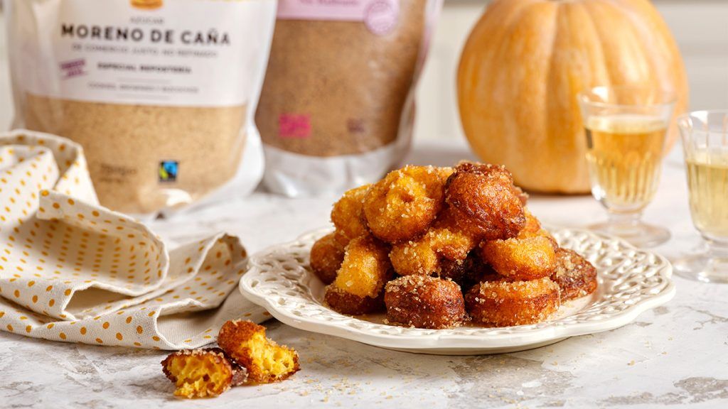5. Girar los buñuelos para que se doren uniformemente, escurrir sobre papel absorbente y rebozar con un poco de Azúcar Moreno de Caña Azucarera.