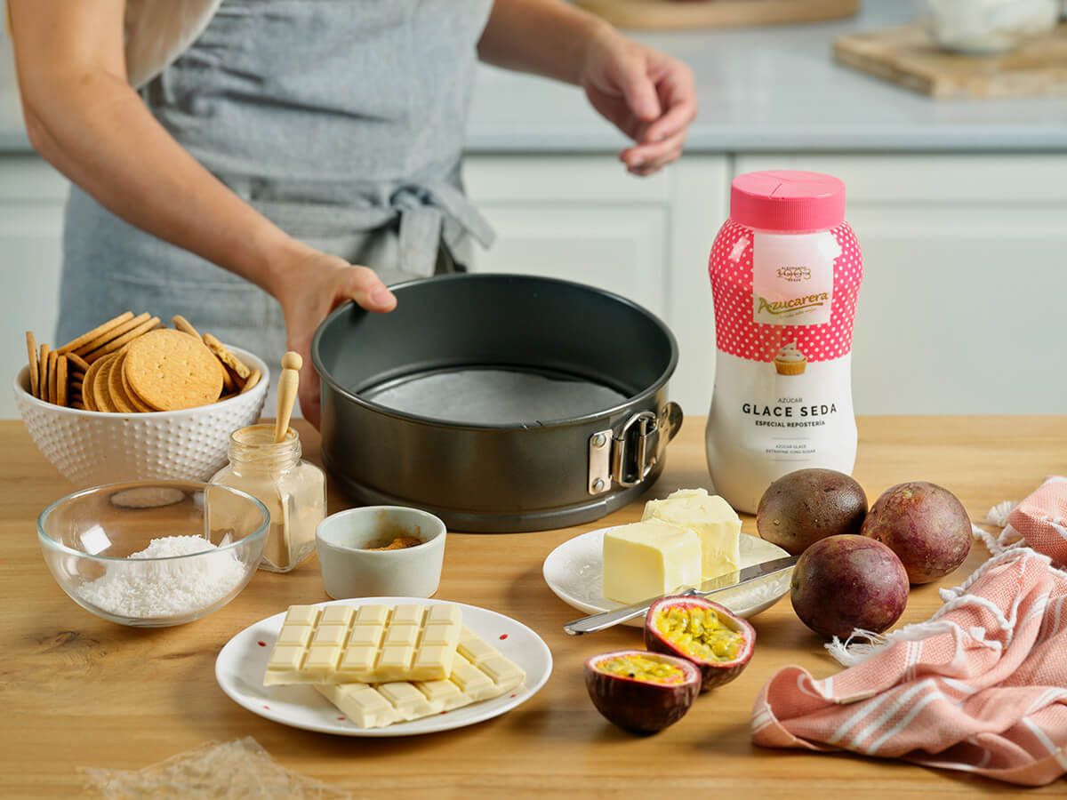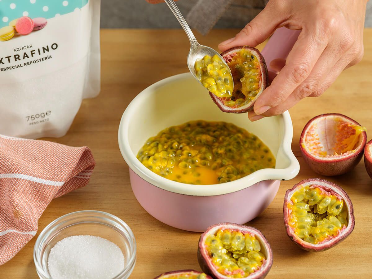 8. Abrir la fruta de la pasión y colar la pulpa de 4 unidades con un colador de malla fina. Mezclarla con la pulpa de la unidad restante. Verter en un cazo, mezclar con el azúcar y calentar hasta que esta se diluya.