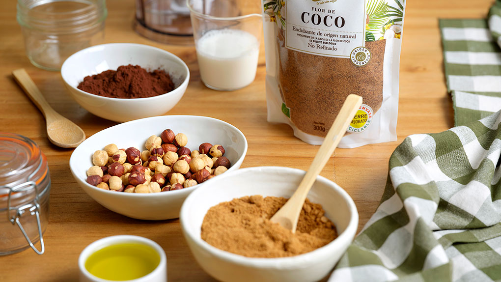 1. En un robot de cocina triturar las avellanas bien finas. Añadir el aceite, el cacao en polvo, La Flor de coco y la leche. Añadir las avellanas molidas y con ayuda de una batidora mezclar hasta que los ingredientes estén bien integrados y la crema sea uniforme.