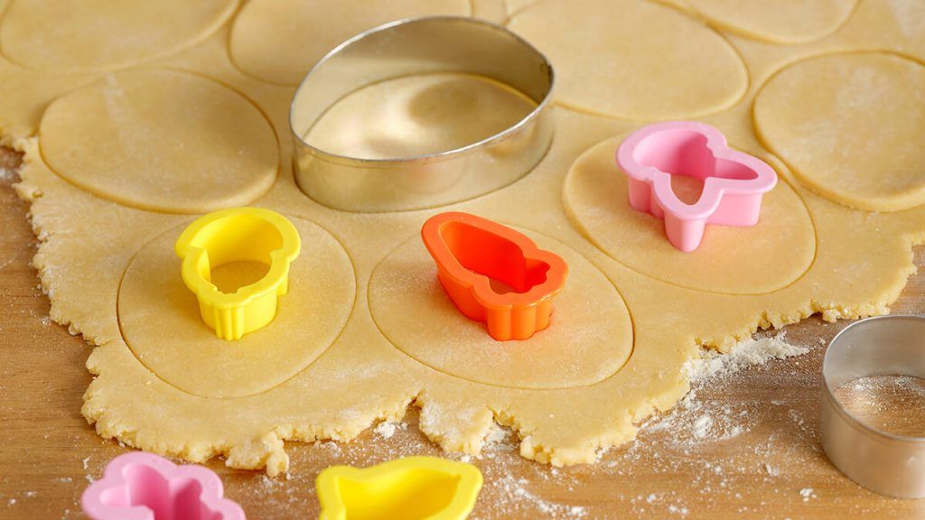 3. Cortar galletas con forma de huevo (con cortapastas o una cartulina en forma de huevo de unos 7-8 cm. de alto) y disponerlas en una placa de horno cubierta con papel sulfurizado. A la mitad de ellas, con ayuda de un cortapastas, cortar en el centro una silueta en forma de pascua (o simplemente una estrellita o corazón). Cocerlas en el horno, precalentado a 180ºC, durante 15 minutos. Repetir la operación con la masa restante.