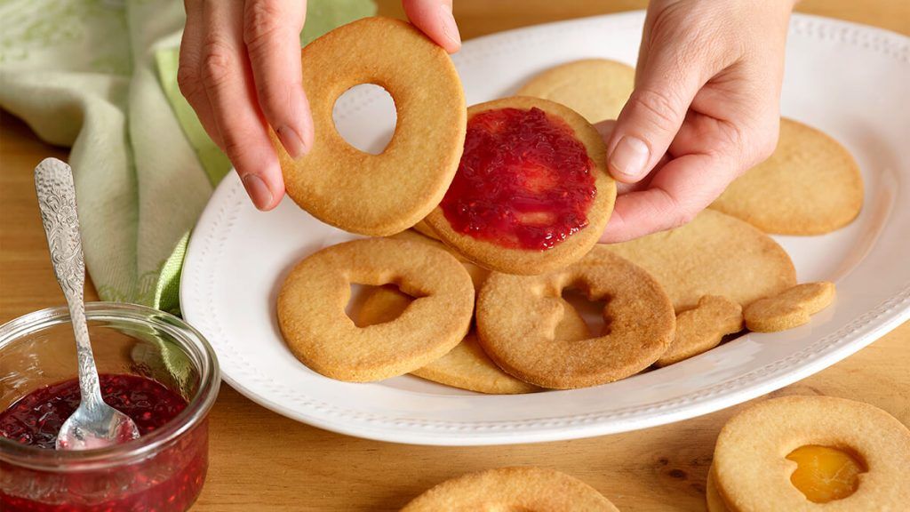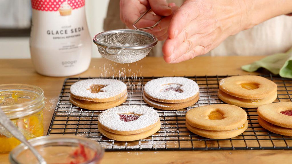 4. Cubrir ligeramente la base de las galletas sin agujero con las mermeladas y tapar con las otras. Disponer sobre una fuente y espolvorear con el azúcar de la decoración.