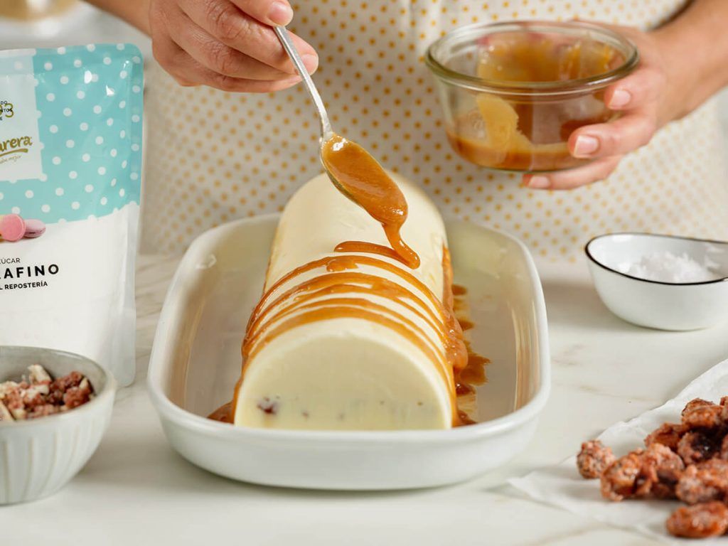 7. Desmoldar, repartir más caramelo y almendras por encima y dejar reposar unos 10-15 minutos antes de servir.