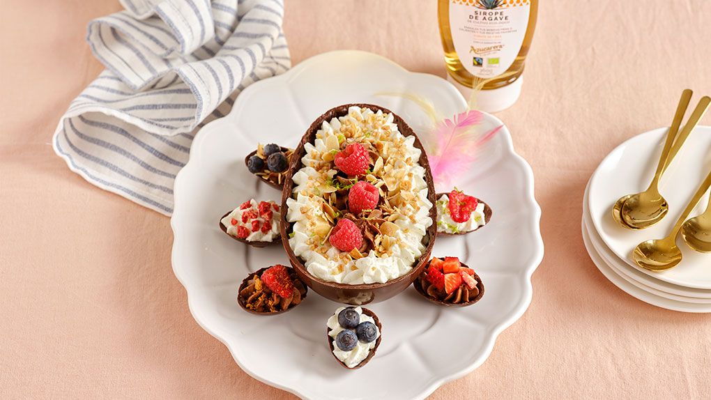 • Colocar galletas picadas en la base de las mitades de huevo preparadas. Rellenar alternando las mousses y decorar por encima al gusto con más galletas, frutas, chocolate y frutos secos