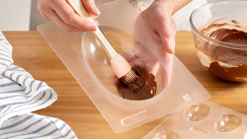 • Untar, con ayuda de un pincel de cocina, moldes para huevos de chocolate (del tamaño deseado) con una capa fina de chocolate y dejar enfriar en la nevera 3-4 minutos hasta que endurezca.