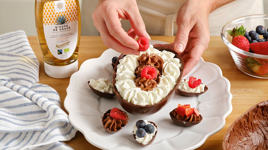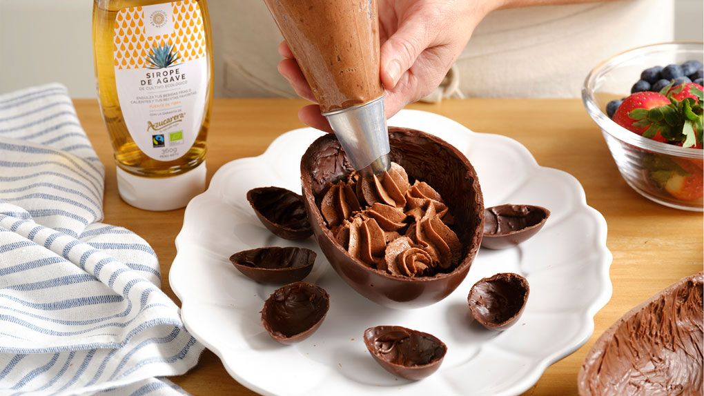 • Colocar galletas picadas en la base de las mitades de huevo preparadas. Rellenar alternando las mousses y decorar por encima al gusto con más galletas, frutas, chocolate y frutos secos